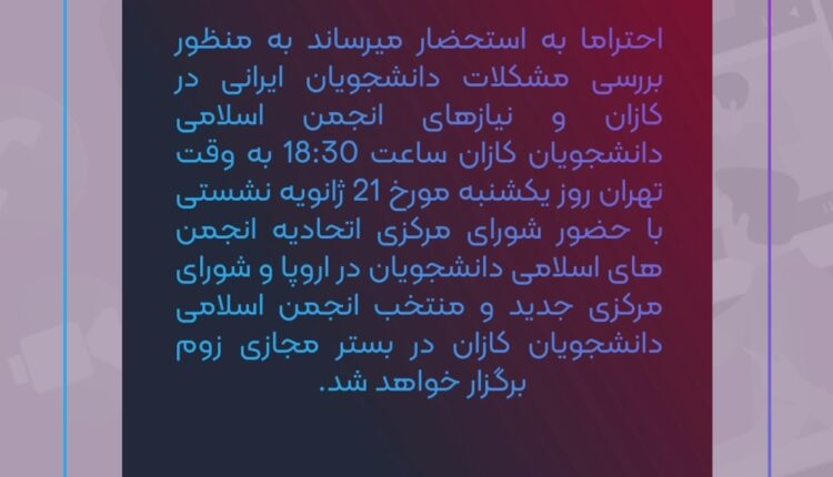 نشست “بررسی مشکلات دانشجویانی ایرانی در کازان” با حضور دبیر‌کل اتحادیه انجمن‌های اسلامی دانشجویان در اروپا و نماینده شورای مرکزی مجمع انجمن‌های اسلامی دانشجویان منطقه فدراسیون روسیه و اعضای شورای مرکزی انجمن اسلامی دانشجویان کازان یکشنبه ۲۱ ژانویه در بستر مجازی زوم برگزار شد.
